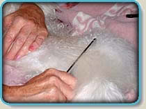- Pettinate il vostro Bolognese soprattutto prima di fargli il bagno. Procedete pettinando prima il pelo sottostante, poi risalite verso l'alto e verso la superficie. Per questa operazione può esservi utile un cardatore, quella spazzola di forma squadrata con morbide setole in ferro.