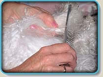 - Dopo aver effettuato lo shampoo, applicate del balsamo diluito con acqua tiepida. Lasciate in posa per 2-3 minuti, durante i quali pettinerete sommariamente il mantello, quindi passate al risciaquo. Il balsamo facilita la pettinabilità del pelo.